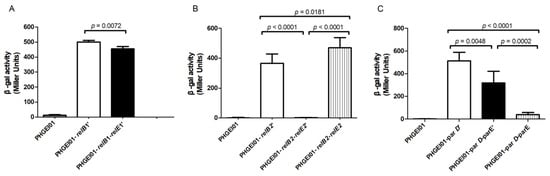 In typical type II TA systems, the antitoxin alone or the TA complex binds to the promoter and regulates the transcription of the TA operon [35]. The β-galactosidase activity was measured in order to study the autoregulation of the three TA (relBE1, relBE2, and parDE) operons, as previously described [36,37]. The plasmids of pHGEI01-antitoxin’ (-relB1’, -relB2’, and -parD’), pHGEI01-antitoxin-toxin’ (-relB1-relE1’, -relB2-relE2’, and -parD-parE’), and pHGEI01-antitoxin-toxin (relB1-relE1, -relB2-relE2, and -parD-parE) were constructed and transformed into E. coli WM3064, respectively. As for the RelBE1 system, the promoter activity in WM3064 cells, carrying the pHGEI01-relB1’ plasmid, was significantly higher than that in cells carrying pHGEI01-relB1-relBE1’ (p = 0.0072) (Figure 6A), indicating that the antitoxin, RelB1, repressed the promoter activity. However, it is a pity that we failed to construct the pHGEI01-relB1-relE1 after several attempts. As for the RelBE2 system, the promoter activity was obviously repressed by the antitoxin, RelB2, but it was enhanced by the RelBE2 TA complex (Figure 6B). Concerning the ParDE system, it was found that the promoter activity in WM3064 cells, carrying the pHGEI01-parD’ plasmid, was significantly higher than that in cells carrying pHGEI01-parD-parE’ (p = 0.0048) and pHGEI01-parD-parE (p < 0.0001). Moreover, it was found that the promoter activity in WM3064 cells, carrying the pHGEI01-parD-parE’ plasmid, was significantly higher than that in cells carrying pHGEI01-parD-parE (p = 0.0002) (Figure 6C), indicating that ParD and ParDE repressed the promoter activity. Additionally, it was confirmed that the ParDE complex repressed the promoter activity more significantly than ParD. Furthermore, concerning the RelBE2 system, the inhibitory effect of antitoxin, RelB2, on the transcription of the TA operon was reversed by its cognate toxin, RelE2. As for the ParDE system, the toxin ParE helped the antitoxin, ParD, to repress the promoter activity. Taken together, these results indicated that RelB1, RelB2, ParD, and ParDE negatively autoregulated the transcriptions of their respective TA operons, while RelBE2 positively autoregulated its TA operon transcription.
