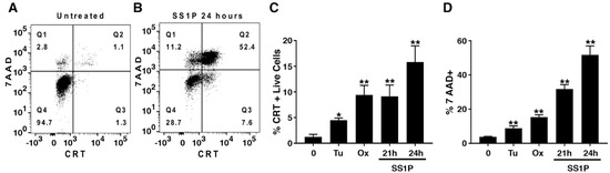 SS1P increases cell surface calreticulin. (A,B) Representative dot plots of (A) untreated AE17M cells or (B) cells exposed to 100 ng/mL SS1P for 24 h and stained with 7AAD and antibodies to calreticulin. (C) Percentage of calreticulin positive cells out of AE17M live cells (7AAD-) after exposure to 65 µM tunicamycin (24 h) or 5 µg/mL Oxaliplatin (24 h) or 100 ng/mL SS1P (21 or 24 h). (D) Percentage of 7AAD positive cells in the treatment conditions described in C. Pool data from two separate experiments is presented. CRT calreticulin, Tu Tunicamycin, Ox oxaliplatin, * p < 0.05, ** p < 0.01.