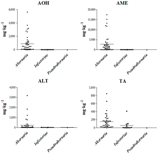 Scatter plot for four examined Alternaria mycotoxins: alternariol (AOH), alternariol mono methyl ether (AME), altenuene (ALT), and tenuazonic acid (TA). Production values represent Alternaria strains belonging to Section Alternaria, Infectoriae, and Pseudoalternaria. Interquartile and median values are reported in the graphs.