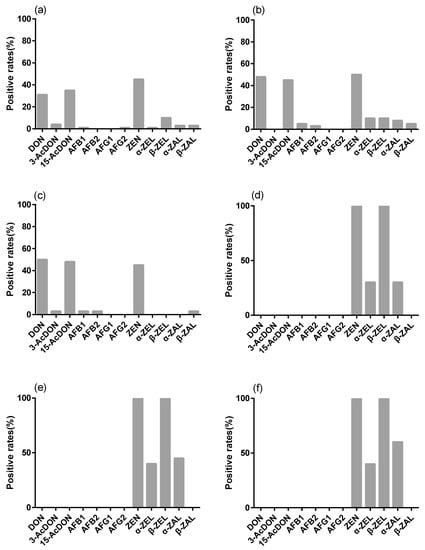 Proportions of samples positive for mycotoxins. (a) Eggs from Jiangsu (JS) (n = 72); (b) eggs from Zhejiang (ZJ) (n = 40); (c) eggs from Shanghai (SH) (n = 40); (d) liver tissue from chickens (n = 30); (e) heart tissues from chickens (n = 20); (f) gizzard tissues from chickens (n = 20).