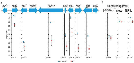 The PKS12 gene cluster (a) and housekeeping genes (b) with mean log2 (label-free relative quantification) intensities of identified proteins and standard error bars calculated from three biological replicates of OE::aurR1 and wt grown on Cz medium. The p-values are calculated from a two-tailed Student’s t-test. Missing/undetected values from the wild type were imputed to reflect low-abundant proteins.