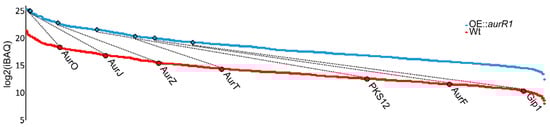 Scatter plots of 908 identified proteins sorted from highest to lowest log2 (intensity-based absolute quantification) intensities calculated from three biological replicates of OE::aurR1 and the wt grown on a Cz medium. The proteins from the PKS12 gene cluster are highlighted and the dotted lines show the correlation between OE::aurR1 and the wt. The wt plot is downshifted by five log2 units.