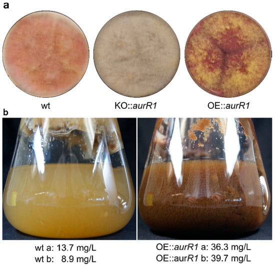 Color differences of wild type and mutants. (a) Wild type Fusarium graminearum (wt), aurR1 knockout mutant (KO::aurR1), and OE::aurR1 grown on a Cz agar medium for 6 days. (b) Cultures of wt and OE::aurR1 grown for 3 days in a liquid Cz medium. 1H-NMR quantification of aurofusarin from biological duplicates are indicated in mg/mL.