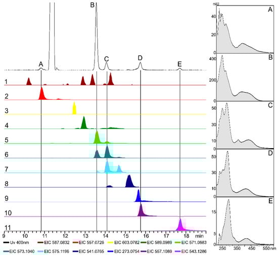 Chromatograms from a metabolite extract of Cz medium 5 days after inoculation with OE::aurR1. Left: a UV 400 nm chromatogram (spectral background subtracted) with selected peaks (A–E) and underlying colored extracted ion chromatograms (EICs) of selected masses (1–11, [M + H]+ ± 0.02 Da) scaled by relative intensities. Right: UV spectra (205–600 nm) for peaks A–E.