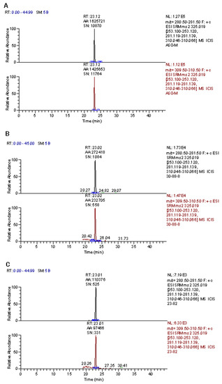 Typical SRM chromatograms of sterigmatocystin (ST) containing I. asprella samples. (A) ST standard; (B) inoculated sample after incubation for seven days at 30 °C and 88% humidity; (C) inoculated sample after incubation for seven days at 23 °C and 82% humidity. Top, quantitative ion; bottom, qualitative ion.