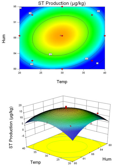 Three-dimensional response surface plots and corresponding contour plots of parameters for ST content in A. versicolor. The contact between temperature and humidity is shown.