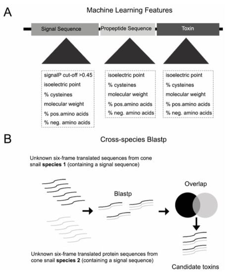 Conotoxins can be classified into different gene superfamilies based on their conserved N-terminal signal sequence [13]. To date, more than 53 conotoxin gene superfamilies have been described for Conus [14]. After NGS sequencing and de novo transcriptome assembly, candidate conotoxin genes are usually assigned to different superfamilies using BlastX, regular expression-based techniques, and profile hidden Markov model (HMMER) analysis against a local reference database of known conotoxins from the Uniprot and/or ConoServer databases. Available tools include ConoPrec, ConoDictor, and Conosorter [5,15,16,17]. However, these approaches can only detect novel toxins that are similar to previously reported sequences. An approach that could overcome the limitations of homology based-searches would thus be highly desirable.