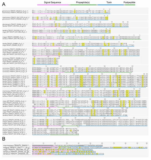 Comparative alignments of selected sequences identified by at least three out of four methods that are (A) likely or (B) not likely to represent genuine novel conotoxins. Cysteines are highlighted in yellow, signal sequences, pro- and postpeptides and predicted mature toxins are underlined in purple, green, and blue, respectively, as shown on top of panel A. Sequence labels (contigs) correspond to those provided in Supplementary File 2.