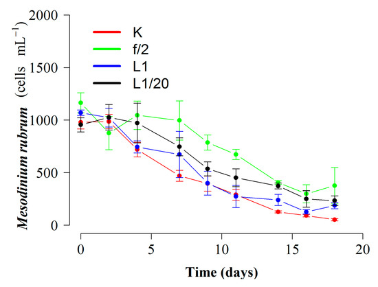 Regarding D. acuta, maximal growth rate—also obtained with K(-Si) medium—was extremely low (µ = 0.06 d−1) and positive growth lasted seven days only. Differences between treatments were not statistically significant (p = 0.67) (Figure 1B). Phototrophic (no cryptophyte prey added) growth rates of the prey, M. rubrum, with the three different culture media in 250 mL at 15 °C were similar for the duration of the experiment, but the initiation of the exponential decline was later (day 7) and the final yield maximal (p < 0.02) with f/2(-Si) medium (Figure 2).