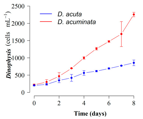 Growth curves of mixotrophic cultures of D. acuminata (VGO1391) and D. acuta (VGO1065) (fed M. rubrum, AND-A071) grown with P. prolonga, CR10EHU) with K(-Si) medium in 4 L flasks at 19 °C and a 16L:8D cycle. Bars represent standard error (n = 9).