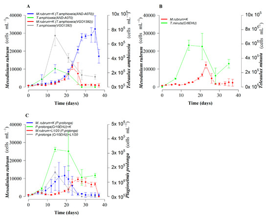Growth of M. rubrum (AND-A071) fed three cryptophyte species with K(-Si) medium: (A) T. amphioxeia strains from Vigo (VGO1392) and Huelva (AND-A070); (B) T. minuta (Cr8EHU), and (C) P. prolonga (Cr10EHU) from the Basque Country, north Spain, with K(-Si) and L1/20 (-Si) culture media. Bars represent standard error.