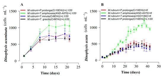 Growth of Dinophysis species with M. rubrum (AND-A071) fed different crytptophyte species. (A) D. acuminata with M. rubrum fed T.amphioxeia (AND-A070), T. minuta (Cr8EHU), T. gracilis (Cr6EHU), and P. prolonga (Cr10EHU). (B) D. acuta with M. rubrum fed two crytptophyte species: T. amphioxeia (AND-A070, VGO1392) and P. prolonga (Cr10EHU). Bars represent standard error.