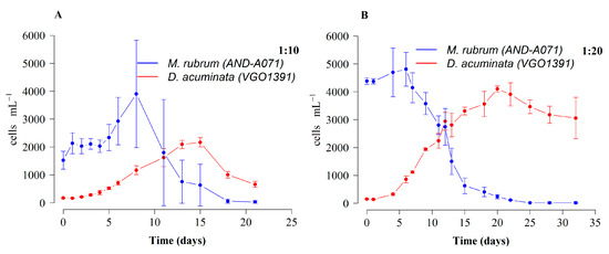 Growth of D. acuminata (VGO1391) fed M. rubrum (AND-A071) grown with T. minuta (CR8EHU) and K(-Si) medium with different predator:prey ratio. (A) D. acuminata:M.rubrum 1:10 and (B) D. acuminata:M. rubrum 1:20. Bars represent standard error.