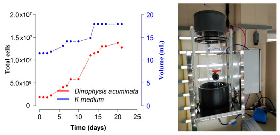 Cultures of D. acuminata with M. rubrum fed T. amphioxeia in a 30 L photobioreactor (right hand picture) with K(-Si) medium at 18 °C. Blue line indicates changes in volume in the photobioreactor.