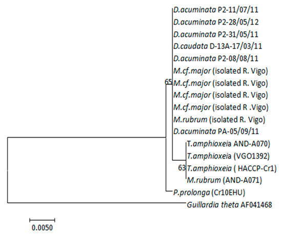 Partial plastid 23S rDNA sequences (373 base pairs, bp) of T. amphioxeia (strains AND-A070 from Huelva and VGO1392 from Vigo) and P. prolonga (CR10EHU, north Spain) cultures, M. rubrum (cultivated strains AND-A071 from Huelva and isolated field specimens from Vigo) and Mesodinium major and Dinophysis isolated specimens from the Galician Rías (see isolation dates in Table 2) were almost identical (Table 2). In fact, a single base pair (bp) difference (out of the 373) was found in the amplified region between the plastids of M. rubrum and T. amphioxeia from Huelva versus those from the Galician specimens (M. rubrum, M. major, and T. amphioxeia). Plagioselmis prolonga, from the Basque country, differed in one additional base pair from these organisms (Figure 8).