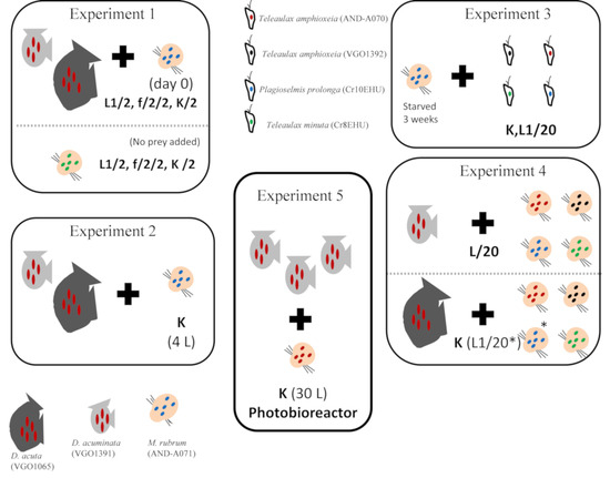 Graphic summary of the species/strains used in the experiments and trophic interactions investigated. Experiment 1: Phototrophic growth of D. acuminata, D. acuta, and M. rubrum with different culture media. Experiment 2: Scaling up mixotrophic cultures of D. acuminata and D. acuta with K medium. Experiment 3: Mixotrophic growth of M. rubrum with different cryptophytes. Experiment 4. Optimal cryptophyte prey for M. rubrum and best M. rubrum ratio to feed Dinophysis. All media were Si free and diluted (1:2). * indicates one treatment using L1 medium with a 1:20 dilution.