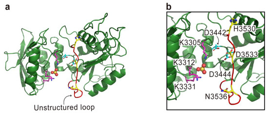 Recently, the three-dimensional structure of PaExoY was solved at a resolution of 2.2 Å via in situ proteolysis-assisted crystallization [75]. Figure 7 shows a structural model of the V. vulnificus ExoY domain generated by using the structure of PaExoY as a template. Similar to PaExoY, CyaA, or EF, the ExoY is likely to consist of two subdomains with a catalytic site between them. The three conserved CRs involving substrate binding and catalysis are indeed gathered near the site (Figure 7). Importantly, K3305, K3312, and K3331 (according to the sequence of MARTX toxin from V. vulnificus BAA87), which are the residues predicted to hold the α-phosphate of substrate ATP, and D3442 and D3444, which are the residues predicted to stabilize the β-and γ-phosphates of ATP via Mg2+ ions, are completely conserved in the CR1 and CR2 regions of ExoY, respectively. The residues predicted to bind to the adenine moiety of ATP, namely H3530, D3533, and N3536, are on the unstructured loop of the CR3 region (Figure 7). This unstructured region will probably be stabilized and form a certain structure upon the binding of actin, as the corresponding ‘switch B’ region of EF does during CaM binding [76].