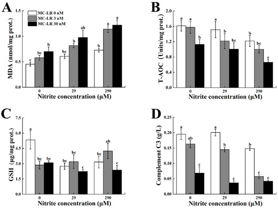 Lin W, Guo H, Wang L, Zhang D, Wu X, Li L, Li D, Tang R. Nitrite Enhances MC-LR-Induced Changes on Splenic Oxidation Resistance and Innate Immunity in Male Zebrafish. Toxins. 2018; 10(12):512. https://doi.org/10.3390/toxins10120512
