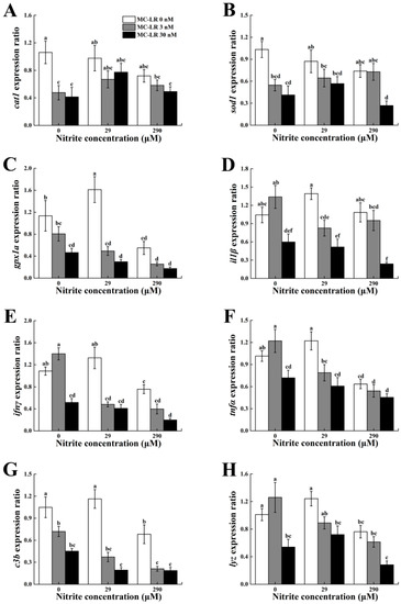 - Wei, L.; Sun, B.; Chang, M.; Liu, Y.; Nie, P. Effects of cyanobacterial toxin microcystin-LR on the transcription levels of immune-related genes in grass carp Ctenopharyngodon idella. Environ. Biol. Fish. 2009, 85, 231. [Google Scholar] [CrossRef]