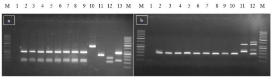 Multiplex PCR for SEs genes: results. (a) Detection of sea, seb, sec, see, and ser genes: lane 1: negative control; lanes 2–9: samples; lanes 10, 11, 12, and 13: positive controls for sec (451 bp), see (213 bp), sea (102 bp), seb (164 bp), sed (278 bp), and ser (123 bp). (b) Detection of seg, seh, sei, sej, and sep genes: lane 1: negative control; lanes 2–10: samples; lane 11: positive control for seg (198 bp), seh (173 bp), and sei (328 bp); lane 12: positive control for seg, seh, sej (131 bp), and sep (396 bp). M, 100 bp size Marker.