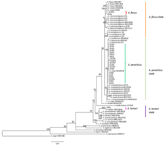 - Soares, C.; Rodrigues, P.; Peterson, S.W.; Lima, N.; Venancio, A. Three new species of Aspergillus section Flavi isolated from almonds and maize in Portugal. Mycologia 2012, 104, 682–697. [Google Scholar] [CrossRef]