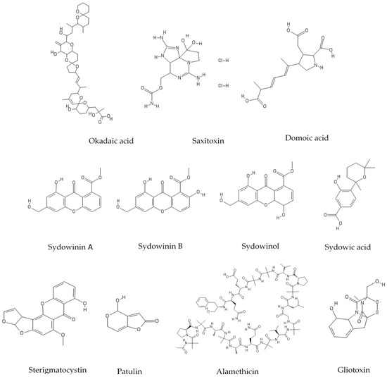 Figure 1. Chemical structures of typical algal toxins (okadaic acid, saxitoxin, domoic acid), dust storm-related mycotoxins (major A. sydowii metabolites and sterigmatocystin), and shellfish-related mycotoxins (patulin, alamethicin, gliotoxin).