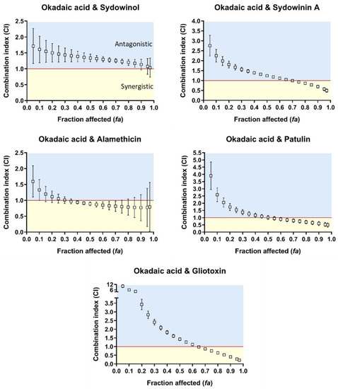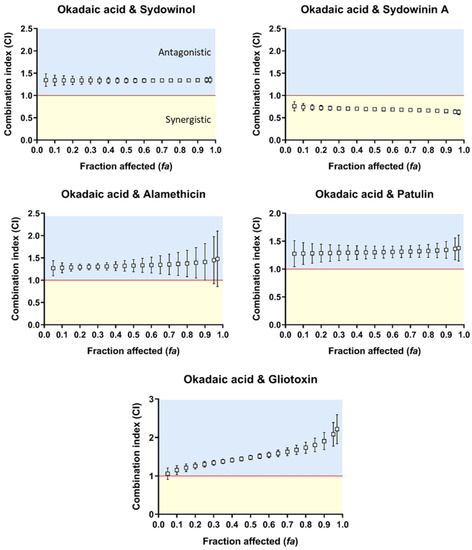 Okadaic acid–sydowinol, –alamethicin, –patulin, and –gliotoxin mixtures on human neuroblastoma SH-SY5Y cells showed an antagonistic interaction type at all effect levels, except that at fa = 0.05; gliotoxin and okadaic acid exhibited an additive interaction type (Figure 3). The calculated CI values for these combinations varied from 1.15 to 2.21 (Figure 3). By contrast, okadaic acid–sydowinin A mixtures exhibited synergisms at all effect levels, with a CI of 0.65 at fa = 0.9. For this combination, at the effect level of 0.9, the okadaic acid and sydowinin A mixture was 3.3 times more effective than okadaic acid alone and 2.9 times more effective than sydowinin A alone (Table 3).