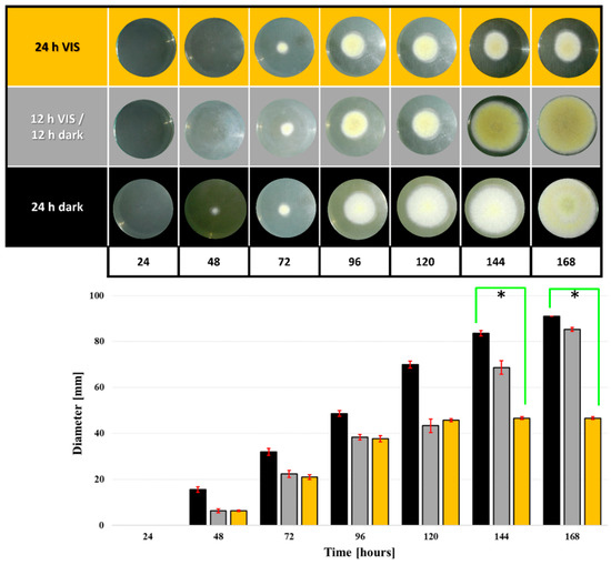 Influence of VIS illumination period on A. flavus colony diameter on YEA plates during 168 h growth period at 29 °C. Statistical significance is highlighted with asterisks (*) while data are expressed as mm of diameter (the mean ± SEM) from three separate experiments.