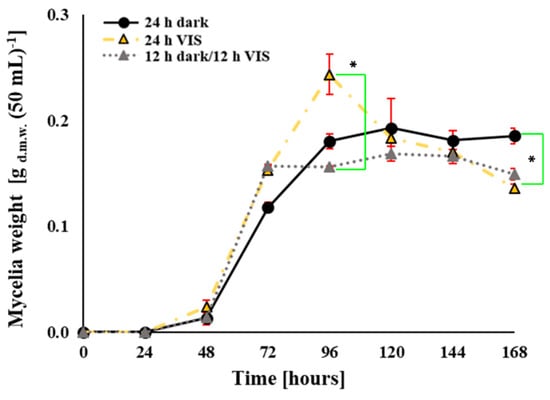 Influence of VIS illumination period on mycelial growth of A. flavus (expressed as gram of dry weight (g.d.w.) per 50 mL) in YES medium incubated at 29 °C for 168 h. Statistical significance is highlighted with asterisks (*) while data from three separate experiments are presented by the mean ± SEM.