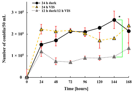 Influence of VIS illumination period on conidia production by A. flavus grown at 29 °C for 168 h in YES medium. Data are expressed as conidia number per 50 mL (mean ± SEM) from three separate experiments. Statistical significance is highlighted with asterisks (*).