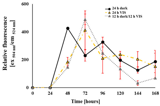 Influence of VIS illumination period on formation of reactive oxidative species in mycelia of A. flavus grown in YES medium for 168 h at 29 °C. Data (mean ± SEM) represents relative fluorescence intensity (λex = 504 nm, λem = 524 nm) from three separate experiments.