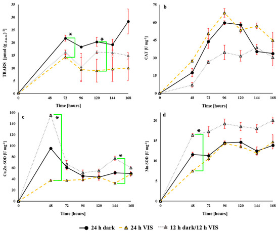 In the case of formation of thiobarbituric acid reactive substances (TBARS) (Figure 6a), our results indicate VIS illumination-dependent activity. At all the time points, the highest level of TBARS were formed when A. flavus was grown under the 24 h dark regime while the lowest levels were from the cultures grown under 24 h VIS illumination. Statistically significant differences were observed only between cultures grown under 24 h dark and 24 h VIS illumination regimes for 72 (p = 0.04) and 120 h (p = 0.03) of growth.