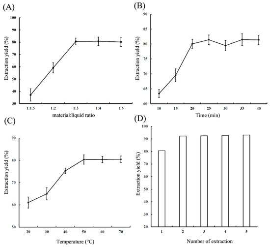 Effects of different extraction conditions on the TTX extraction yield: (A) material:liquid ratio; (B) extraction time; (C) extraction temperature; (D) number of extractions.