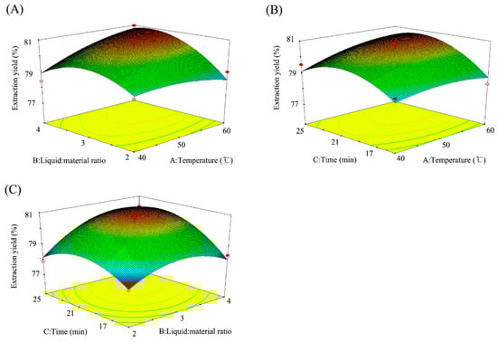 Response surface analysis of different factors: (A) liquid:material ratio and extraction temperature; (B) extraction time and temperature; (C) extraction time and material:liquid ratio.