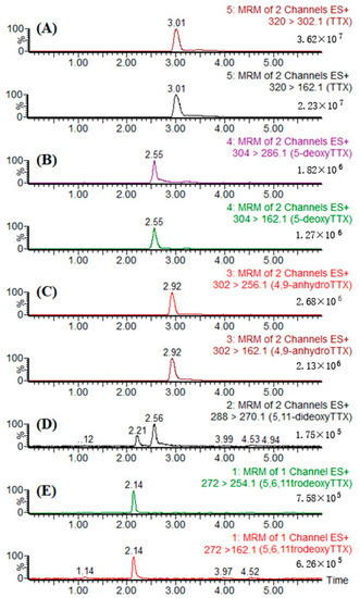 Monitored transitions of different TTX analogues extracted from the liver of T. pseudommus: (A) TTX; (B) 5-deoxy TTX; (C) 4,9-anhydro TTX; (D) 5,11-dideoxy TTX; (E) 5,6,11-trideoxy TTX. MRM, multiple reactions monitoring mode.