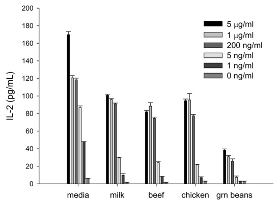 We evaluated if IL-2 secretion by activated splenocyte cells can be used for detection of SEA in different food products. Milk, beef, chicken, and green beans were spiked with various concentrations of SEA and samples were incubated with splenocyte cells. However, due to food matrix interference, the high background reduced the signal-to-noise ratio. To eliminate this matrix interference, we separated SEA from spiked food products by employing immunomagnetic beads that were coated with an anti-SEA antibody. The toxin was extracted from beads and incubated with mouse spleen cells for 24 h. In Figure 1 our ELISA shows that we can detect SEA in food products and that there is a correlation between the extracted SEA concentrations and IL-2 protein secretion from splenocyte cells.