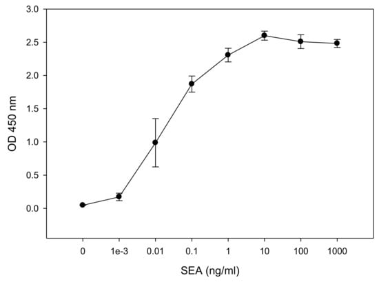 This ex vivo method has further advantages over the in vivo monkey and kitten bioassays. As well as dramatically limiting the number of animals used, one mouse spleen can be used for 500 tests, such an ex vivo bioassay requires the sacrifice of living animals and therefore raises the same ethical concerns regarding the use of experimental animals. Accordingly, we sought an alternative to mouse splenocytes and so performed experiments to evaluate the use of the human CD4+ T-cell line CCRF-CEM for the measurement of biologically active SEA. This was done in conjunction with Raji B-cells as antigen presenting cells (APCs). After incubation for 24 h of the co-culture with various concentrations of SEA, ELISA was used to quantify the relative concentration of secreted IL-2. The ELISA results in Figure 2 show that SEA induces differential IL-2 protein secretion in a dose-dependent manner. One-way analysis of variance (ANOVA) was applied to determine the limit of SEA detection. The result shows that the sensitivity of the assay for SEA is 0.01 ng/mL. Figure 2 shows that 0.010 ng/mL SEA increases ELISA detection of IL-2 secretion from 0.0463 ± 0.00145 OD (Optical Density) in the control case to 0.987 ± 0.363 OD with a p-value < 0.001 (lower than 0.05).
