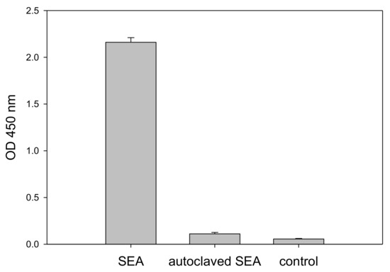 It is important to be able to distinguish active from inactive toxin. Thermal processing is the primary standard by which foods are treated for the elimination of bacterial contamination as well as to inactivate their toxins. We next examined the response to heat inactivated SEA. SEA was heated by autoclaving for 15 min (15 psi, 121 °C) and compared with unautoclaved, active SEA in the CCRF-CEM T-cell line assay. Figure 3 shows that only active SEA is able to induce IL-2 secretion during the incubation period, while heat inactivated SEA produces results comparable to the control without SEA. This result demonstrates that the assay can distinguish between biologically active SEA and heat inactivated SEA which poses no health risks.