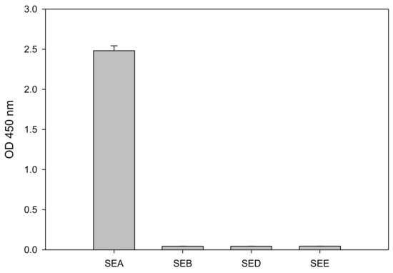 SEs shares considerable amino acid sequence similarity and therefore the specificity and cross reactivity of the assay for SEA should be evaluated. To inspect the specificity of the test we applied 1 µg/mL of SEA, SE types B, D and E (SEB, SED, and SEE, respectively) to the CCRF-CEM T-cell line in combination with the Raji B-cell line. As shown in Figure 4, SEA but not SEB, SED, or SEE stimulate the CCRF-CEM T-cell activation, as demonstrated by IL-2 secretion. Although SEA and SEE share 70–90% sequence homology [18] and consequently belong to the same SE group [19,20], SEE produces no response. Only SEA is able to activate the CCRF-CEM T-cell and induce secretion of IL-2. This result indicates that this test is specific to SEA detection.