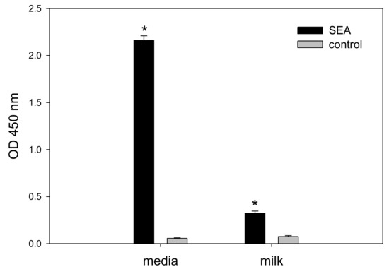 Detecting 1 µg/mL of SEA in spiked milk. Spiked milk was added to 85 µL of cell culture media; IL-2 was analyzed after incubation for 24 h. Error bars represent standard errors, and significant differences (p < 0.05) between spiked and un-spiked milk are represent with an asterisk*.