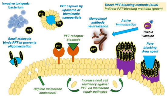 Given the multi-step process of host cell engagement and pore formation after toxin secretion by the bacterium, there exist multiple stages at which a PFT toxin can be targeted for inhibition, both directly and indirectly. While direct toxin inhibition involves physical binding to the monomer to preclude interaction with the host cell or interruption of the oligomerization process, indirect methods have been described including prevention of binding to the host cell receptor, pore blockade or stimulating membrane repair pathways to boost the cell’s ability to mitigate toxin-induced damage (Figure 1). Small molecules, some repurposed from other areas of medicine, liposome and nanoparticle platforms, and monoclonal antibodies or toxoid vaccine-induced humoral responses, comprise the repertoire of agents discussed in the ensuing sections.