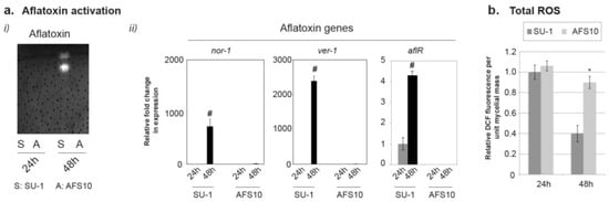 Decrease of total ROS during activation of aflatoxin biosynthesis. (a) Comparison of (i) aflatoxin accumulation and (ii) Gene expression levels relative to 24 h of three aflatoxin pathway genes in SU-1 and AFS10. (b) Comparison of total ROS at 24 h and 48 h. The error-bars represent standard error of the mean. The two-tailed p-value was determined using unpaired t-test (GraphPad statistical software). #, Significant difference of transcript levels between 24 h and 48 h (p-value < 0.05, n = 3); * Significant difference of total ROS between SU-1 and AFS10 (p-value < 0.05, n = 3).