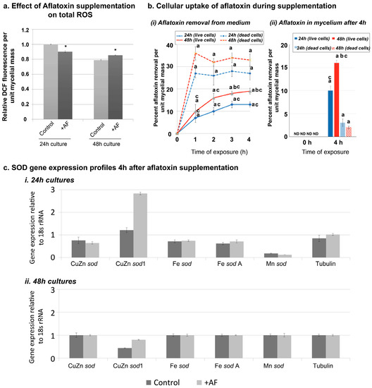 Finally, we also examined whether aflatoxin supplementation resulted in changes in the expression levels of the SOD genes either in 24 h or 48 h cultures. Contrary to the total ROS readings, there were no significant changes in SOD expression that were attributable to AF supplementation (Figure 3c), thereby suggesting the possibility that aflatoxin supplementation induced changes in the total ROS are acute biochemical effects.