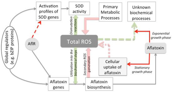 Proposed model for total ROS management in A. parasiticus. Based on our current findings and previous reports we propose that aflatoxin-dependent protection occurs in one or a combination of the following ways: (a) utilization of ROS in the biochemical steps of the biosynthesis pathway [33], (b) aflatoxin-dependent reduction of ROS in cells at exponential growth phase (current study) and (c) aflR-dependent reduction of ROS (current study) possibly through its gene regulatory impacts outside the aflatoxin pathway gene cluster [43,44]. Aflatoxin-dependent biochemical processes that sequester ROS still remain uncharacterized (green dashed arrow). Pink arrows indicate the sources of ROS accumulation. These include ROS generation from primary metabolic processes, secondary ROS generated from aflatoxin biosynthesis [45], and ROS generated upon aflatoxin uptake by cells during stationary phase of growth (based on aflatoxin supplementation data from 48 h AFS10 cultures in the current study). The mechanisms that result in ROS accumulation upon cellular uptake of aflatoxin remains uncharacterized (pink dashed arrow). The model can now explain the physiological need of the cells to co-regulate secondary metabolism (in this case, aflatoxin biosynthesis) and oxidative stress response through the bZIP proteins [3,24,25,26,27,28,29,30,31]. Red arrows indicate the contributions of the current study. The molecular mechanism of aflR-mediated regulation of SOD genes remains uncharacterized (red dashed arrow) and will be investigated in our follow up studies.