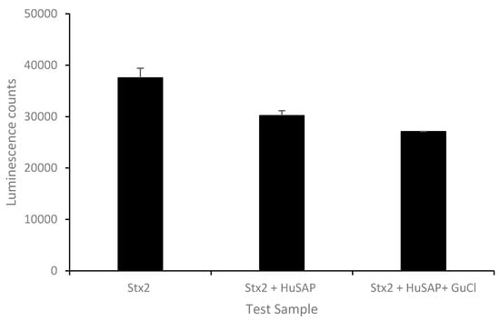 To examine if HuSAP is the only factor inhibiting the ELISA-based detection of Stx2 in human serum, commercial HuSAP at 50 µg/mL (HuSAP circulating in human blood ranges from 25 to 50 µg/mL) was mixed with pure Stx2 (10 ng/mL) in the presence of 5% BSA (an analog of human serum albumin) and then tested by ELISA. Figure 6 demonstrates that the ELISA signal obtained from Stx2 samples mixed with HuSAP was significantly lower than that from samples without HuSAP added (p ≤ 0.01). However, the inhibition from HuSAP was about 20%, which is much less when compared with the inhibition from the serum spiked with 10 ng/mL of Stx2 (~69.6%), suggesting that in addition to HuSAP, there are likely other components in human serum that interfere with Stx2 detection. Next, we evaluated the ability of GuCl to ablate the inhibition caused by HuSAP. Figure 6 indicates that the average ELISA signal from samples (Stx2 plus HuSAP) treated with GuCl was even lower than samples without GuCl treatment (p ≤ 0.05). This result indicates that GuCl is not effective at recovering the inhibition of ELISA-based Stx2 assays from pure HuSAP.