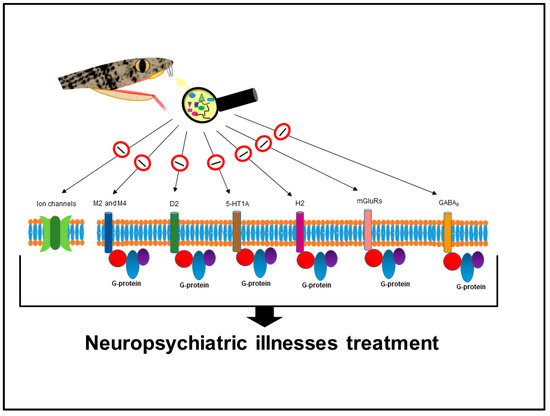 Different drug classes to treat neuropsychiatric illnesses have been associated to the venom; their respective targets are illustrated in Figure 1.