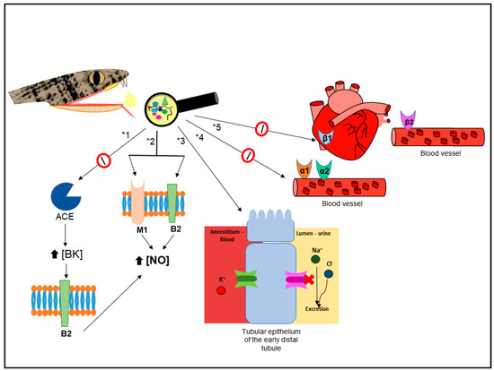Schematic representation of established and hypothesized (this work) mechanisms of action that contribute to the overall antihypertensive effect of B. jararaca venom. ACE—Angiotensin-converting enzyme; BK—bradykinin; B2—subtype 2 of bradykinin receptor; M1–subtype 1 of muscarinic receptor; NO–nitric oxide; α1—subtype 1 of the α-adrenergic receptor; α2–subtype 2 of the α-adrenergic receptor; β1—subtype 1 of the β-adrenergic receptor; β2—subtype 2 of the β-adrenergic receptor; *1—antihypertensive pathway based on [2]; *2—antihypertensive pathway based on [118]; *3 to *5—hypotheses, raised after C-map analysis, suggesting that B. jararaca venom may present: (*3) components acting similarly to thiazide/thiazide-like molecules; (*4) α-adrenergic receptor blockers; and (*5) components inhibiting both β1 and β2-adrenergic receptors contributing to the antihypertensive effect.