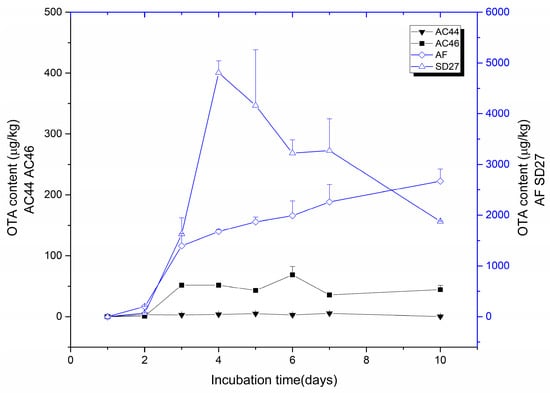 The OTA producing ability of four strains (AC44, AC46, SD27 and AF) during incubation periods in Czapek Yeast Extract Agar (CYA) culture medium were analyzed. On the basis of the experiment the strains could be divided into two classes, namely MT strains (AC44 and AC46) and HT strains (SD27 and AF). The amount of OTA produced by the investigated strains is shown in Figure 1. The content of OTA varied especially according to different HT and MT groups. For SD27 strains, the OTA synthesis commenced from the 2nd day, then sharply increased to the highest content (4808 μg/kg) at the 4th day, then decreased by about 2.5 fold over the following days. The other HT strain AF showed a different trend compared with SD27 strain, with the content of OTA gradually rising over the 10-day measurement period to 2670 μg/kg. Regarding the MT strains, AC44 and AC46 showed a similar trend that the OTA synthesized from the 2nd day remained stable over the remaining days. The content of OTA was 0–5.4 and 0.8–68.6 μg/kg for AC44 and AC46 strains, respectively, being some 2000–5000 of μg/kg less than the HT group.
