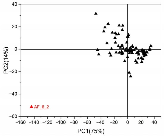 In order to find outliers, an unsupervised pattern recognition method (PCA) was performed in this study. All data were scaled using a Pareto scaling method. As shown in Figure 3, PC1 accounted for 75% and PC2 accounted for 14% of total variation. An outlier (coded as AF_6_2 in red) stood out from the major group of samples. It was caused by the variation of the internal standard, which meant that the content of the internal standard was significantly lower in the sample marked as AF_6_2 than others. This sample was excluded from further analysis.