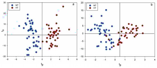 After that, two OPLS-DA models were carried out to differentiate between MT and HT groups. For untargeted profiling method, the result is shown in Figure 4a, the OPLS-DA model for CYA medium demonstrated that the fungi were clearly divided into two clusters according to their different toxigenic ability. The model generated one predictive and four orthogonal (1 + 4) components with R2 of 85.0% and Q2 was 67.4%. In order to prove the robustness of this untargeted profiling method, the data obtained from quantitative analysis of GC-MS was also performed as a control method. Another OPLS-DA model based on quantitative analysis (the dataset was 52 × 83) was constructed and the result is shown in Figure 4b. Some overlapping occurred in the two-dimension score plot. Besides, the model generated one predictive and five orthogonal (1 + 5) components with R2 and Q2 values of 68.4% and 50.9%, respectively, which means that the performance of this model was not as good as the OPLS-DA model based on the untargeted GC-MS profiling.